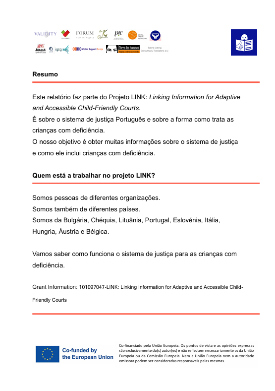 O objetivo geral desta ação é melhorar a integração dos sistemas de proteção das crianças nos processos penais para apoiar e proteger as crianças vítimas de violência e discriminação. Procura abordar a Prioridade 5 do convite à apresentação de propostas, bem como a Estratégia da UE sobre os Direitos da Criança Temática 3, alinhando com os objetivos contidos na Estratégia da UE sobre os Direitos das Vítimas, a Estratégia da UE para a Igualdade de Género e as prioridades do programa CERV da UE para 2021-2027. O projeto LINK cumpre a prioridade 5 ao reforçar e integrar melhor os sistemas de proteção da criança a nível nacional e local nos processos penais. O reforço e uma melhor integração serão feitos através da implementação adequada de processos de avaliação individuais multidisciplinares e abrangentes para as crianças vítimas com e sem deficiências psicossociais e/ou intelectuais.